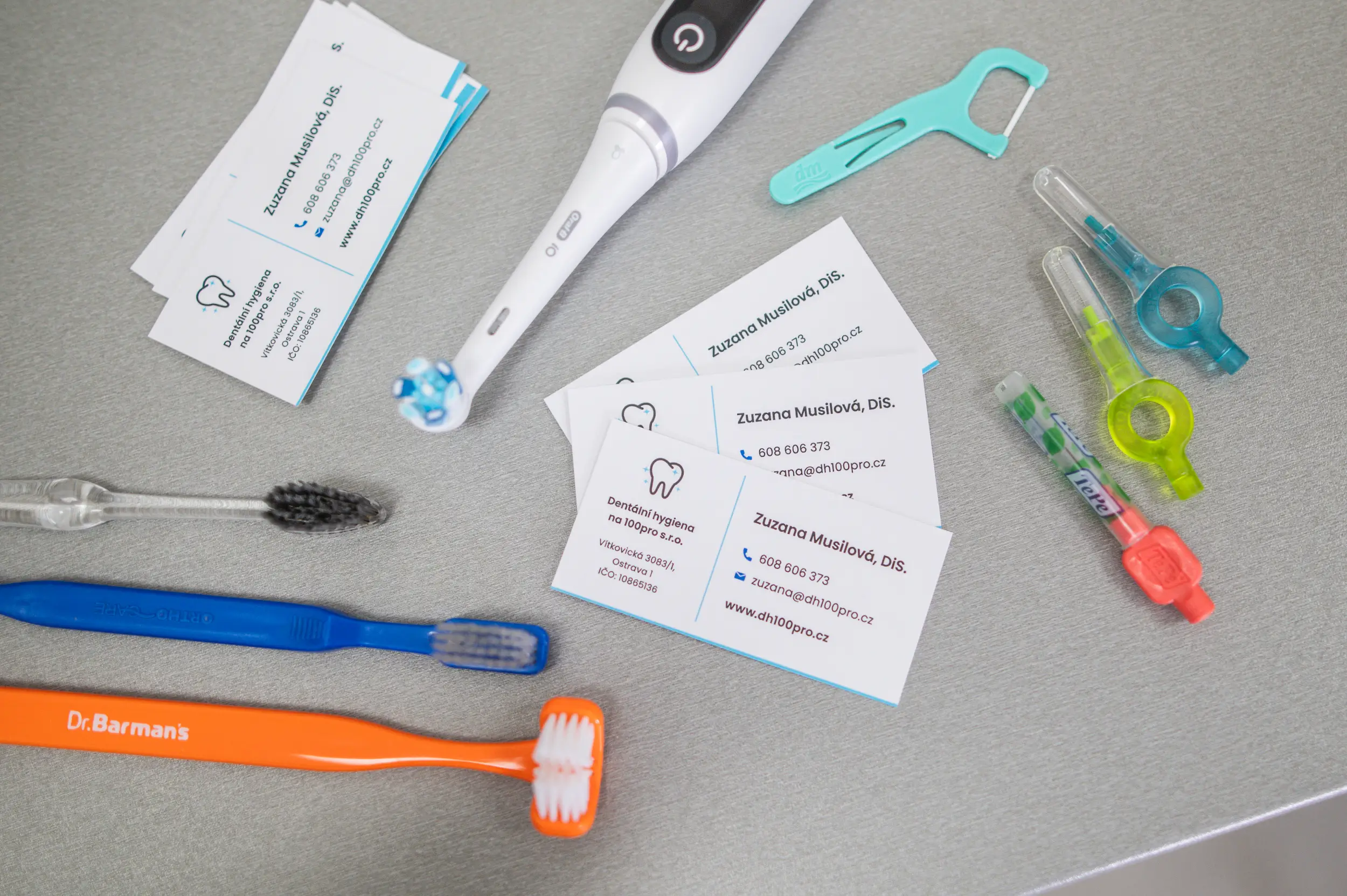 Pomůcky osobní zubní hygieny, které běžně používáte – pro vyhodnocení, jestli je domácí péče dostačující a pomůcky funkční.